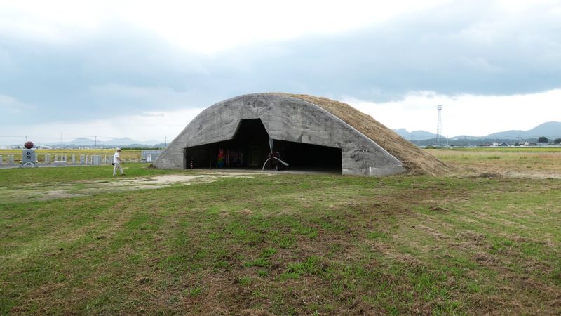 第二次世界大戦前から大分県の宇佐市には海軍航空隊があった。それは海軍のパイロットを養成するためのものだったが、戦争末期には特攻隊が編成され多くの若者が出撃していった。それゆえこの周辺は米軍による空襲を何度も受けた。そのため飛行機を守る防御施設が造られた。その防御施設が「掩体壕(えんたいごう)」と呼ばれている。早い話が飛行機の防空壕で、平らな場所に飛行機一機を隠すように石やセメントで覆われている。それらがいくつも現存しており、実に不思議な景色を作り出している。近くには長い一直線の道路があり、滑走路の跡だという。もちろん現在も幹線道路として使われている。