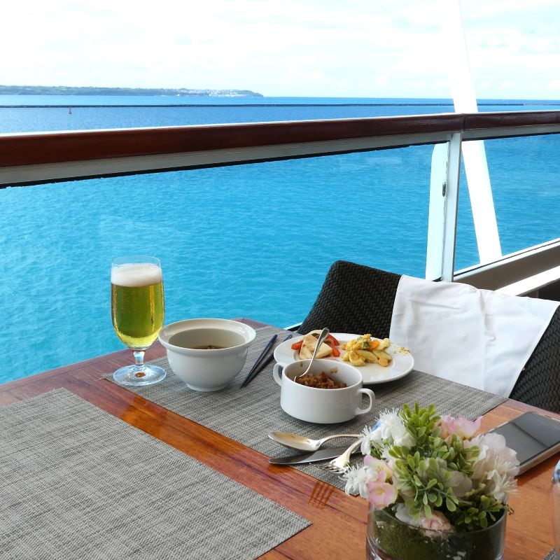 三井オーシャン富士② 「三井オーシャン富士」に乗ってきた。”美食の船”で知られている「にっぽん丸」の後継と目されている船で、豪華な料理や豪華な部屋を味わってきた。写真は沖縄の宮古島でのランチの風景で、海を身近に感じながらの食事は格別だった。尚、本日その旅行記を公開した。